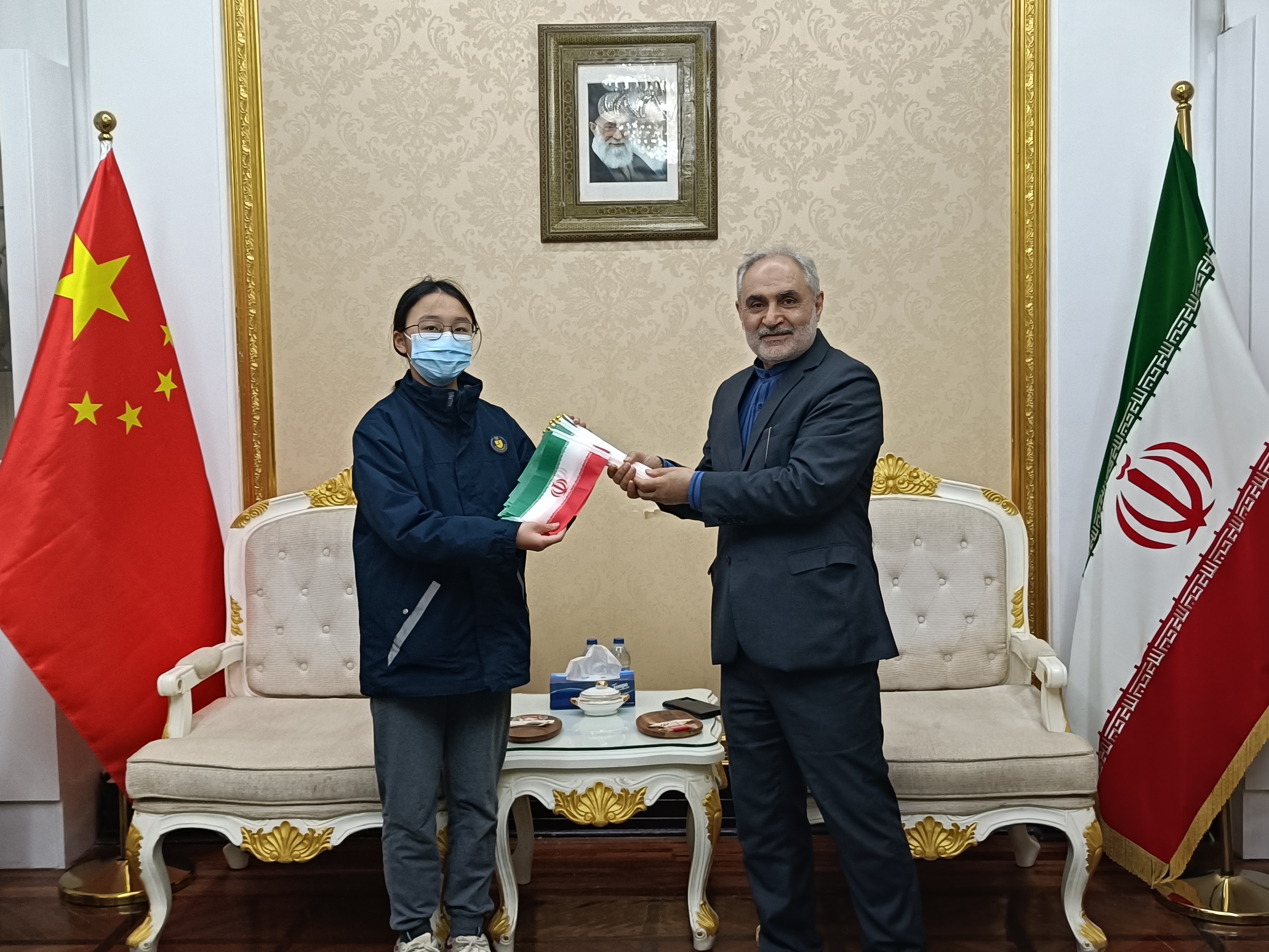 اهداء پرچم کشورمان به نمایندگی جمهوری اسلامی ایران در شانگهای توسط یک دانش آموز چینی